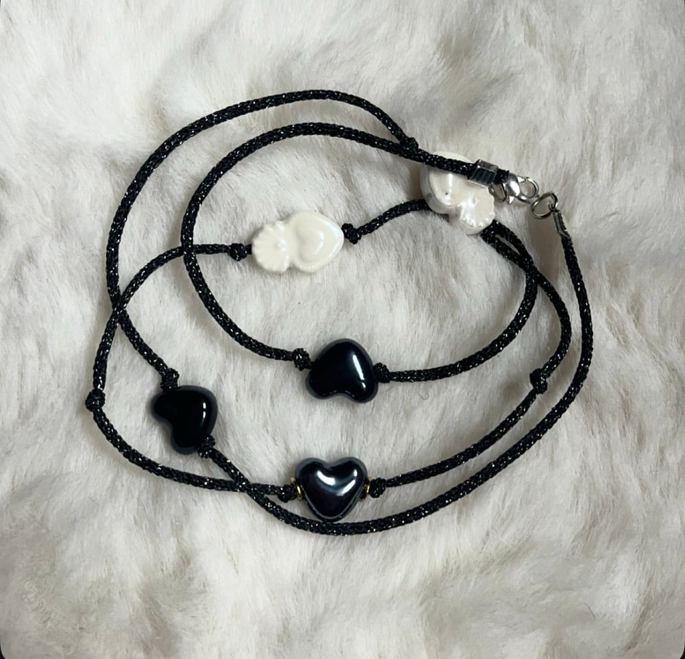 2 en 1 , collier ou bracelet à vous de choisir :) fil noir et brillant et cœurs brillants .