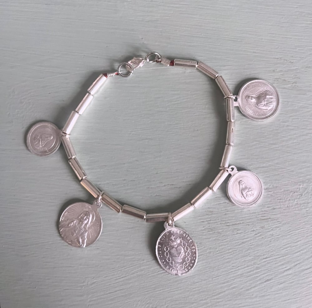 Bracelet argenté et médailles anciennes . Fermoir 16/18 cm