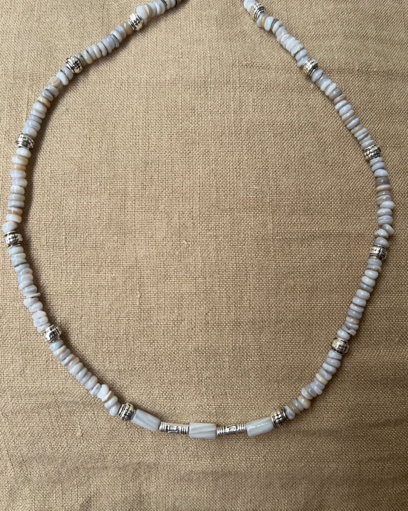 Collier perles d eau douce grises et argentées . 45 cm