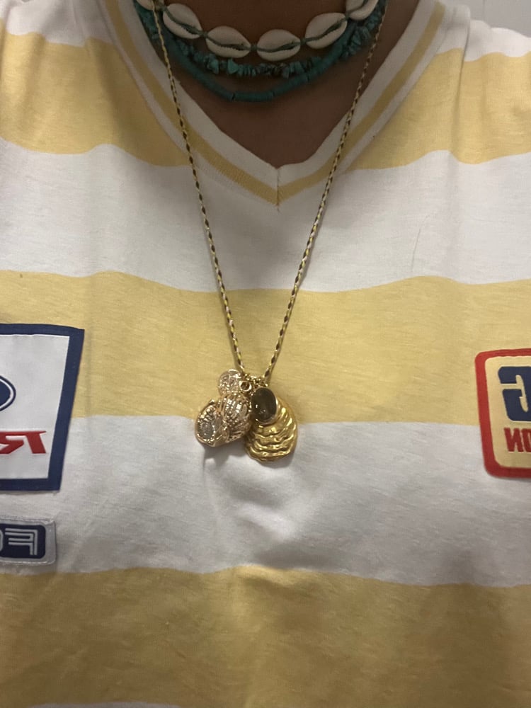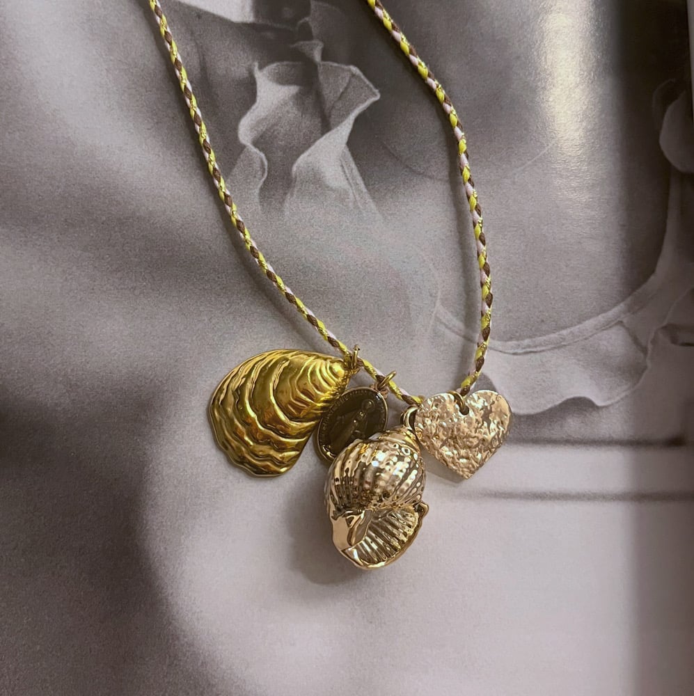 Collier 65 cm . Fermoir . Coquillage . Médaille miraculeuse et cœur .