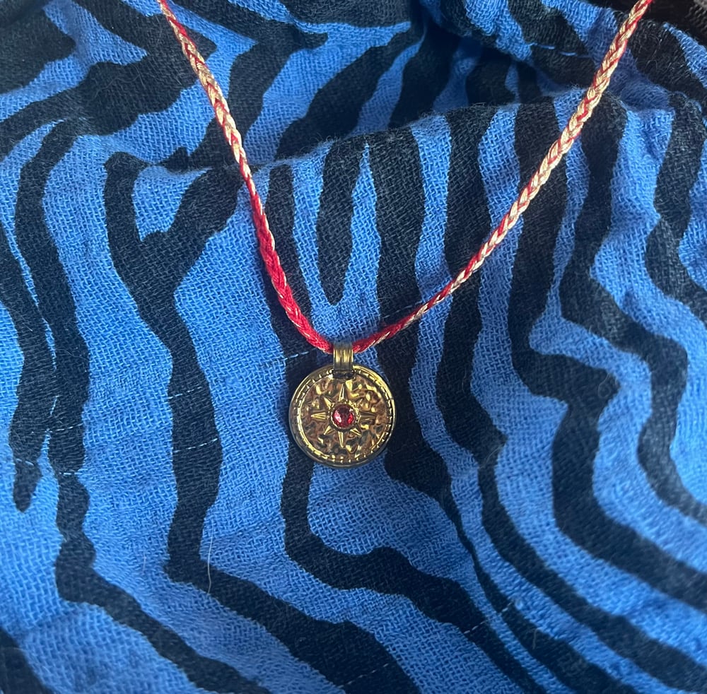 Collier médaille dorée et strass rouge . Fermoir doré . 40 cm