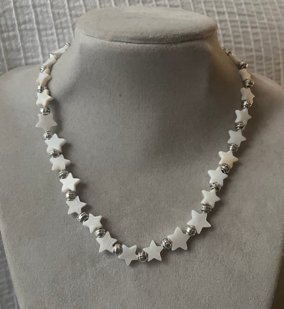 Collier étoiles nacrées et perles argentées . 45 cm