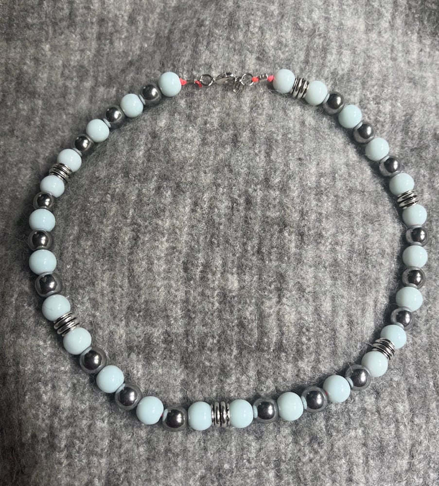 Collier perles bleu glacier et argentées . 40 cm