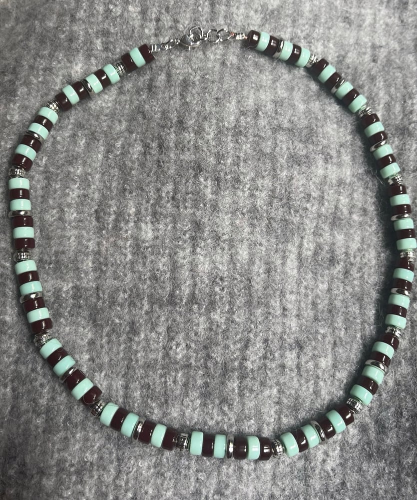 Collier bordeaux et bleu glacier et argenté.