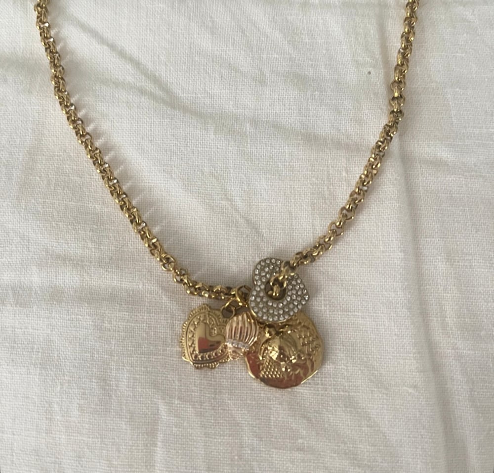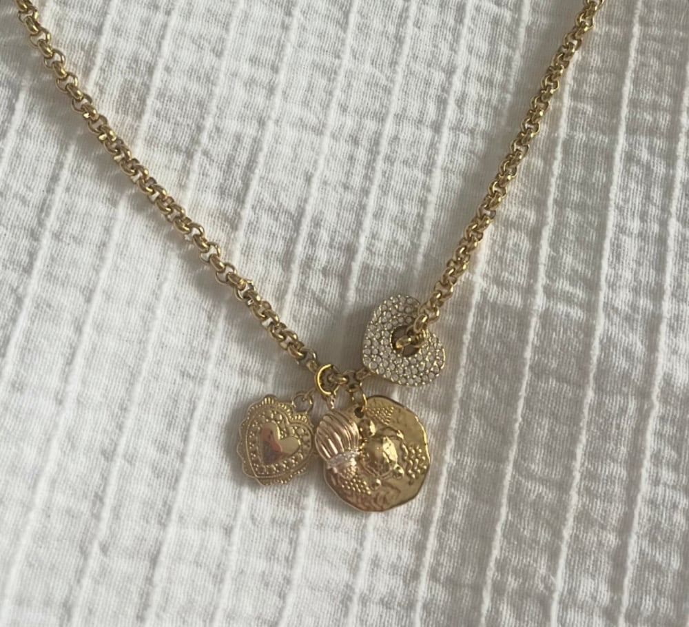 Collier acier doré à l or fin . Médailles dorées et brillants .