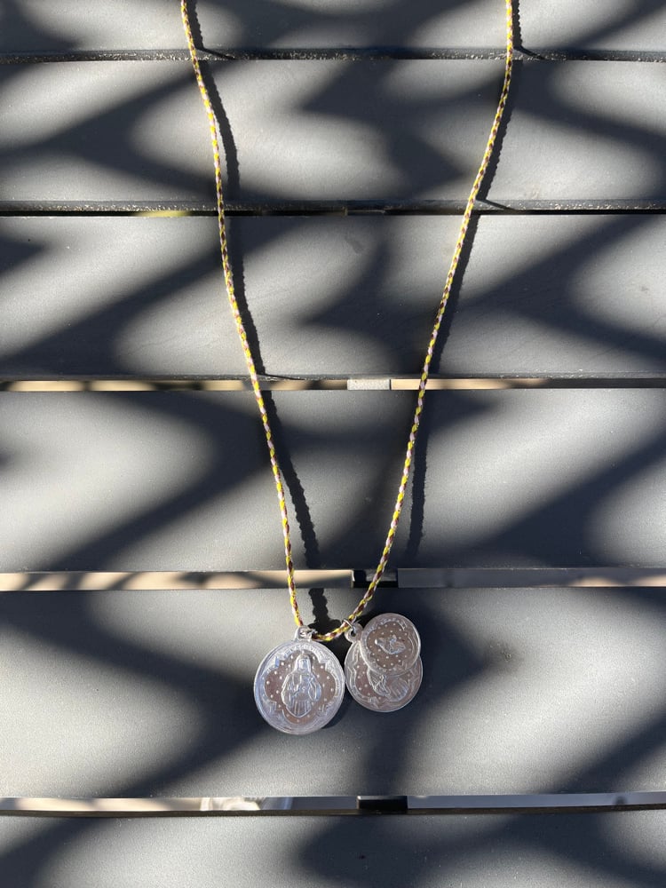 Sautoir 65 cm . Médailles anciennes argentées , toutes différentes donc uniques .