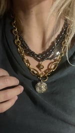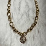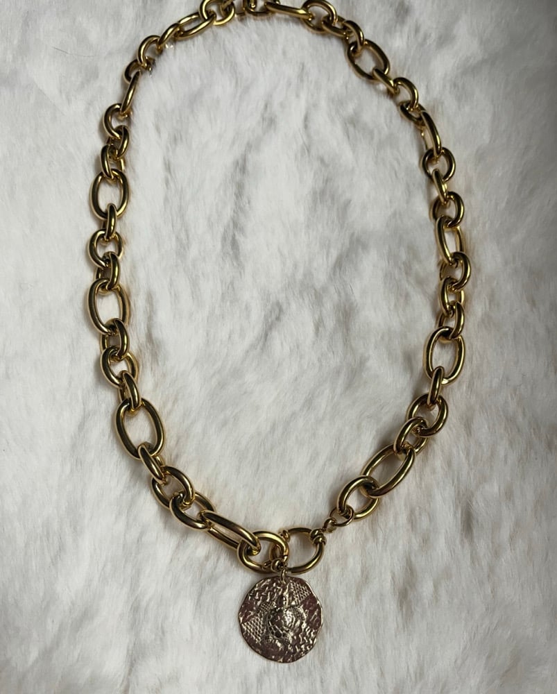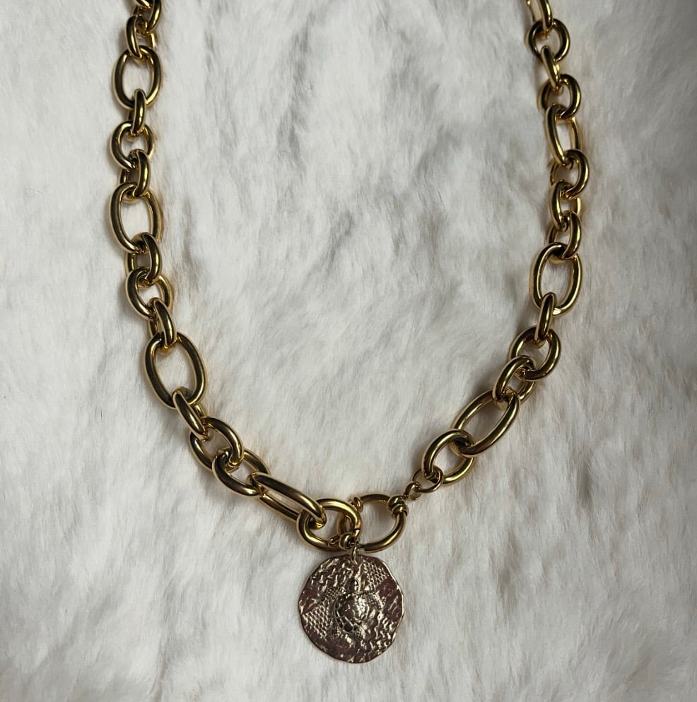 Collier en acier inoxydable doré et medaille dorées à l or fin . 50 cm , ce collier ne bouge pas dans le temps , il est un peu lourd car les mailles sont assez grandes .