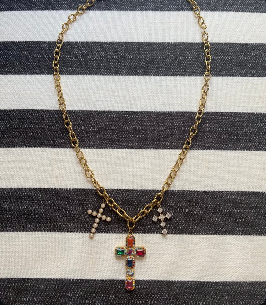 Collier sautoir acier dorée et 3 croix brillantes et perles dorées .